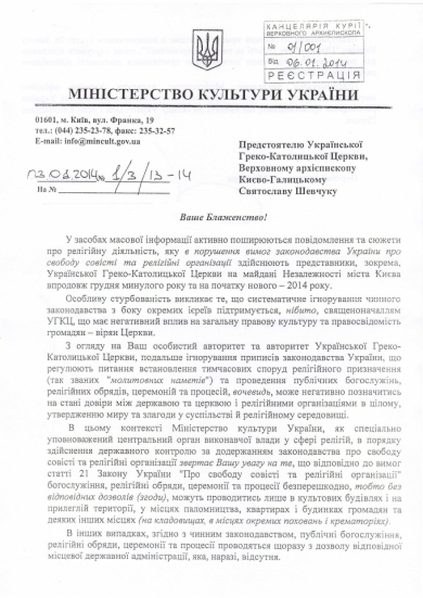 Причиною такої реакції органу державної влади названо релігійну діяльність, яку нібито «в порушення вимог законодавства України про свободу совісті та релігійні організації здійснюють представники, зокрема Української Греко-Католицької Церкви, на Майдані Незалежності міста Києва впродовж грудня минулого року та на початку нового – 2014 року».