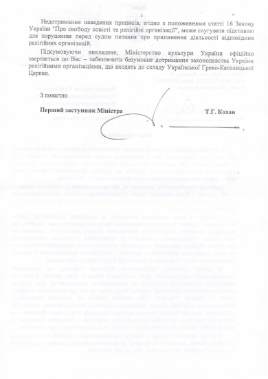 Оскільки цей лист має офіційний характер – як такий, що стосується самого факту існування та служіння УГКЦ – і оскільки викладене тлумачення Закону України «Про свободу совісті та релігійні організації» зачіпає все релігійне середовище України, відчуваю своїм обов’язком заявити таке.