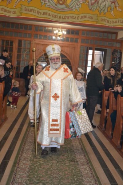 Діти та молодь зустрічали Його піснею про Святого Миколая. Миколая також зустріли парох, протоієрей о. Іван, та Владика Аркадій.