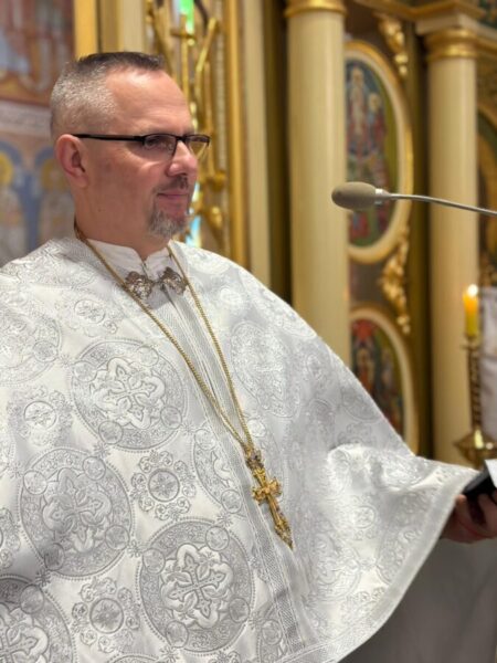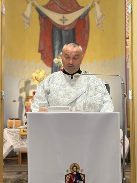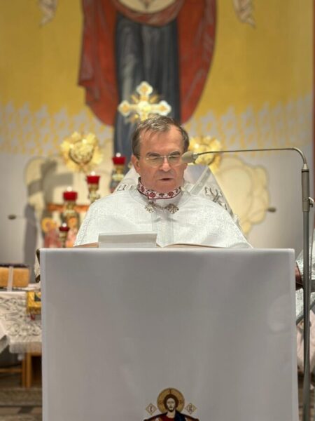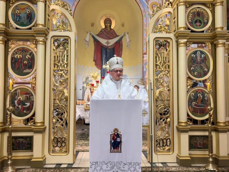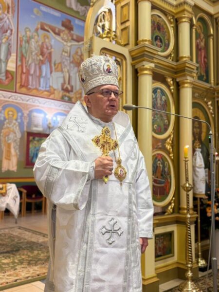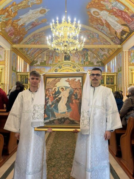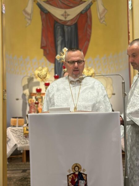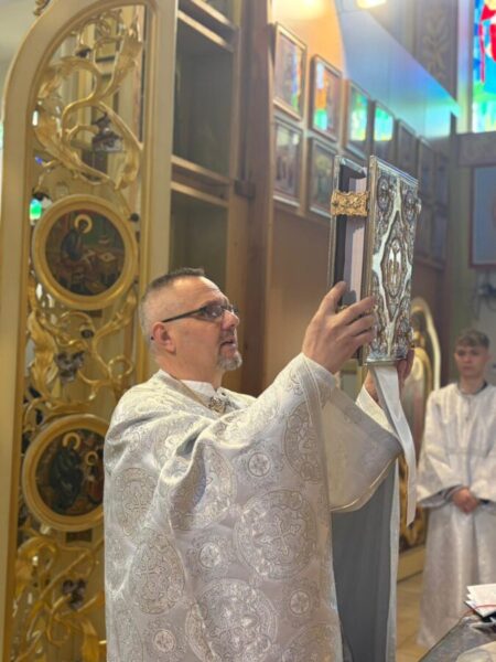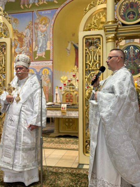 Під час читання Євангелія перші слова були проголошені різними мовами: владика прочитав грецькою та латинською, о. Станіслав, староцерковнослов’янською, а о. Іван, українською та англійською. У своїй проповіді владика звернувся до вірних із словом духовного зміцнення та пасхальними побажаннями.