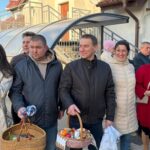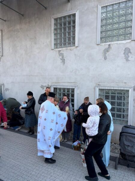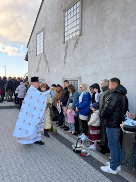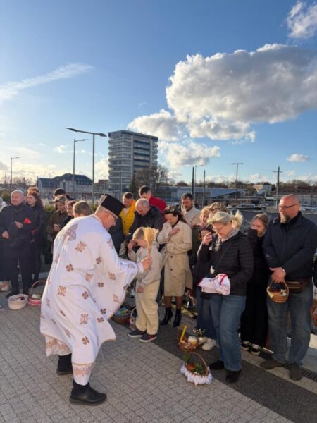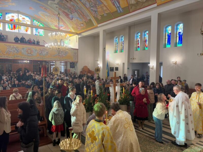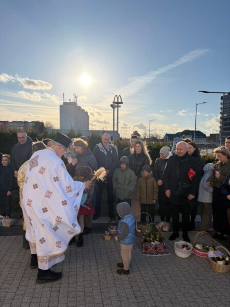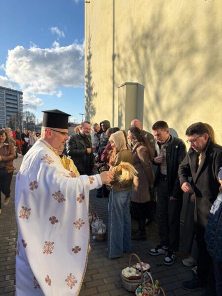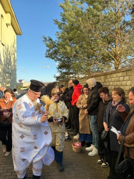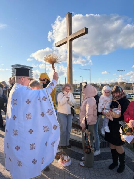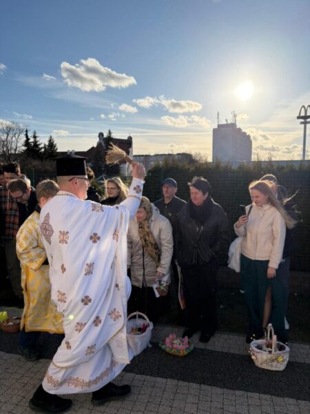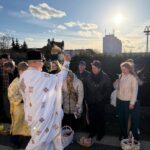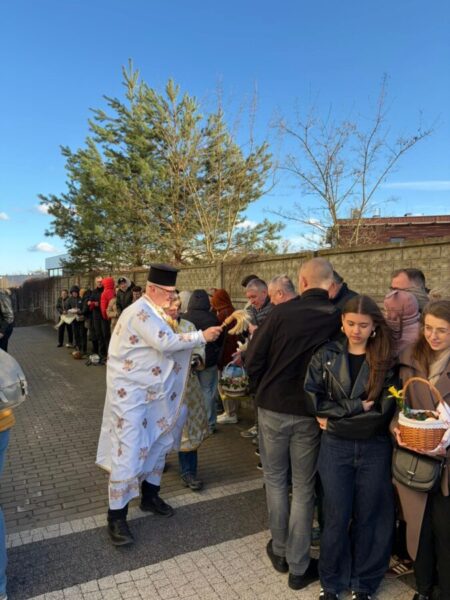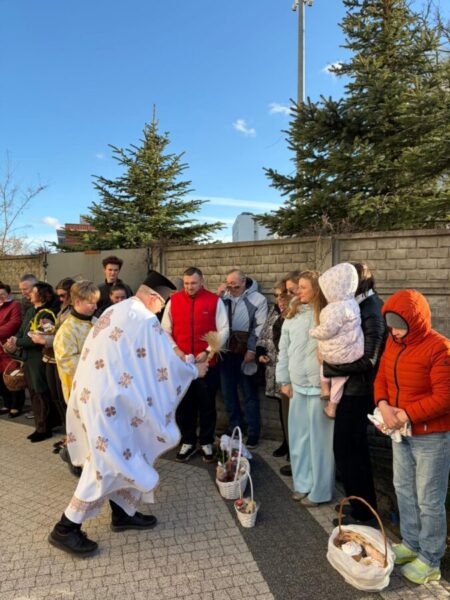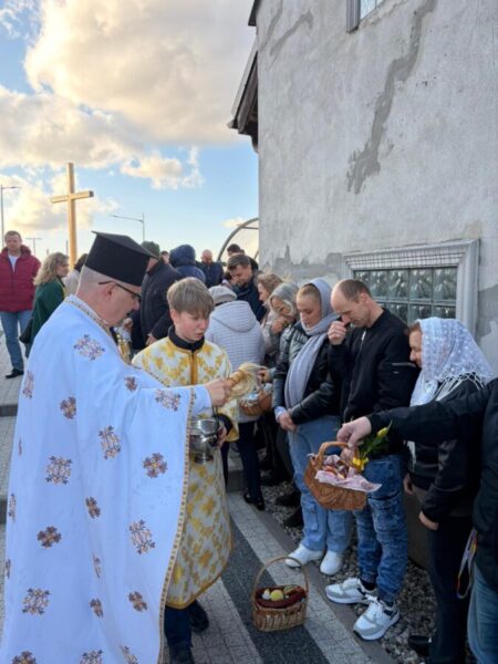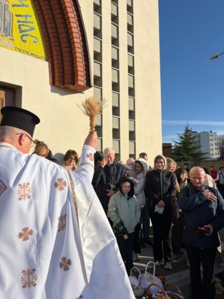 Після богослужіння духовенство разом із вірними вийшли на подвір’я собору, де відбулося освячення пасок та великодніх страв.